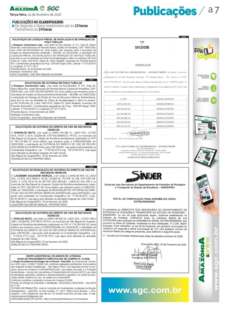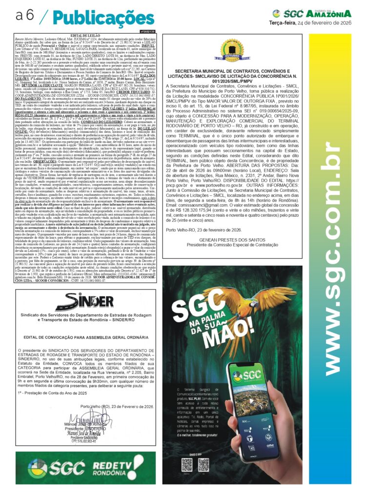 O Sindicato dos Servidores do Departamento de Estradas de Rodagem e Transporte do Estado de Rondônia – SINDER/RO publicou dois editais convocando seus filiados para participarem de Assembleia Geral Ordinária e Assembleia Geral Extraordinária, que serão realizadas no próximo dia 28 de fevereiro de 2026 (sábado), na sede da entidade, situada na Rua Venezuela, nº 2.205, Bairro Embratel, Porto Velho/RO.